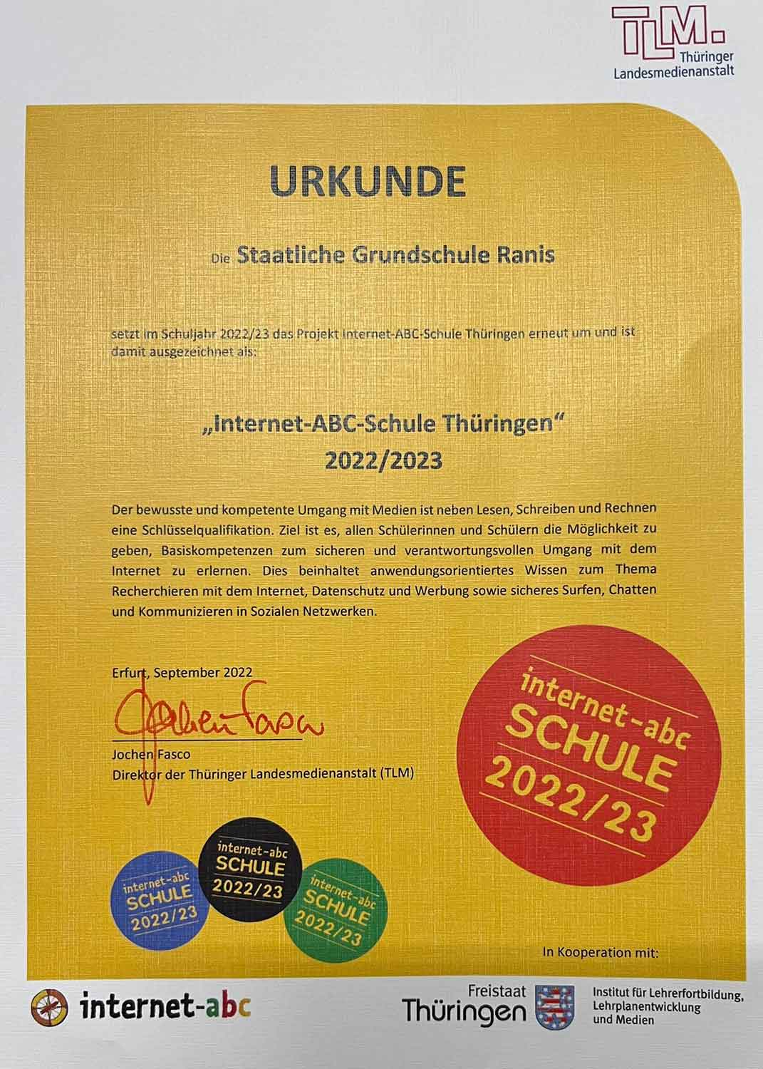 Unsere kleine Grundschule befindet sich am nordöstlichen Ortseingang der Stadt mit wunderschöner Aussicht auf die Burg Ranis.
